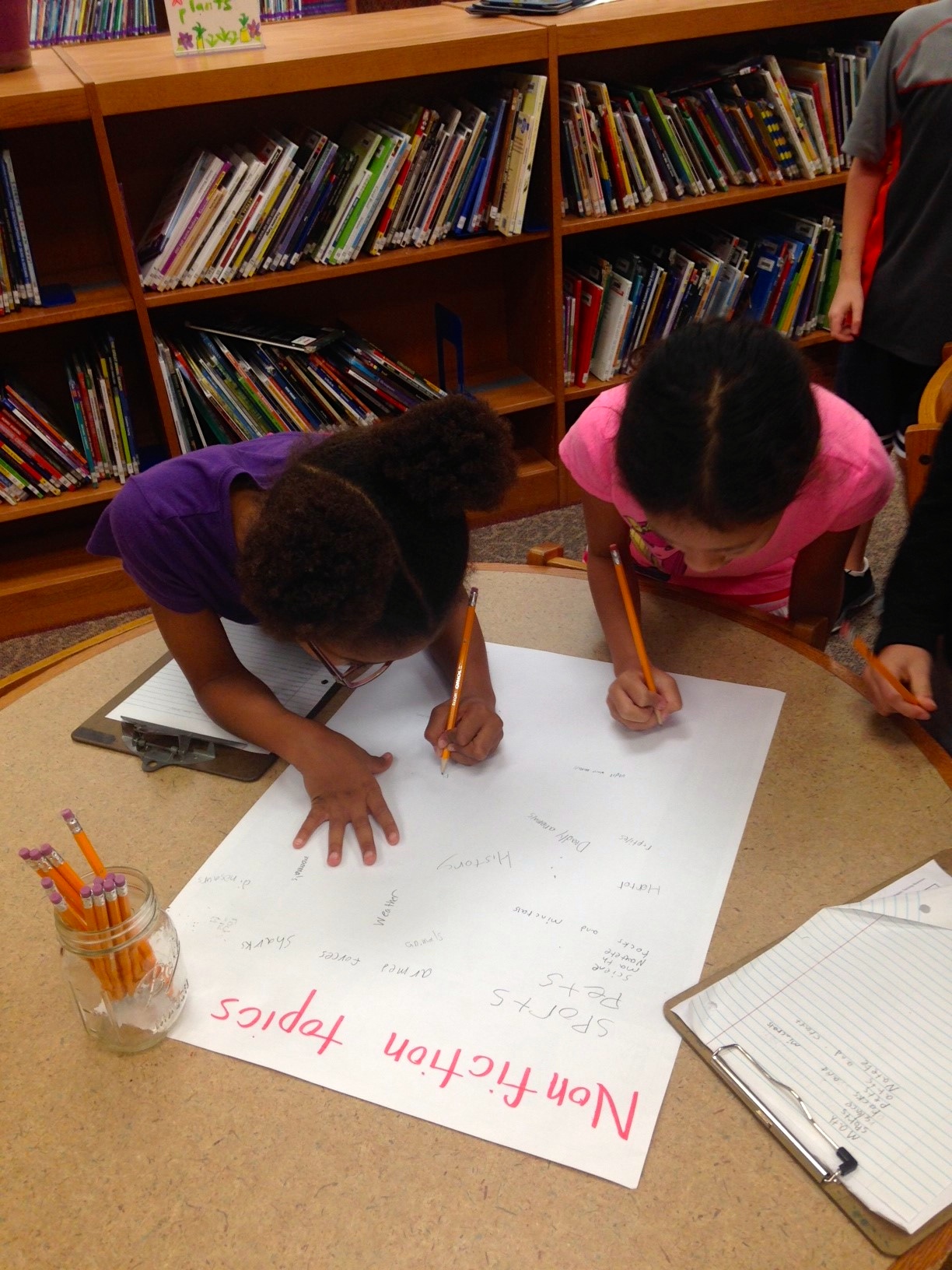The 3rd graders arrived at the school library today with clipboards and pencils in hand. Mrs. Patrick, BSE’s school librarian, presented this key question: What can we observe from the way our school library is organized to help set up your new classroom library? As the young investigators traversed the library jotting notes, new questions and considerations surfaced. “But our classroom doesn’t have this much space…”, “What kinds of books are most popular in 3rd grade?” Great thoughts! Next the students organized their notes into categories on chart paper.