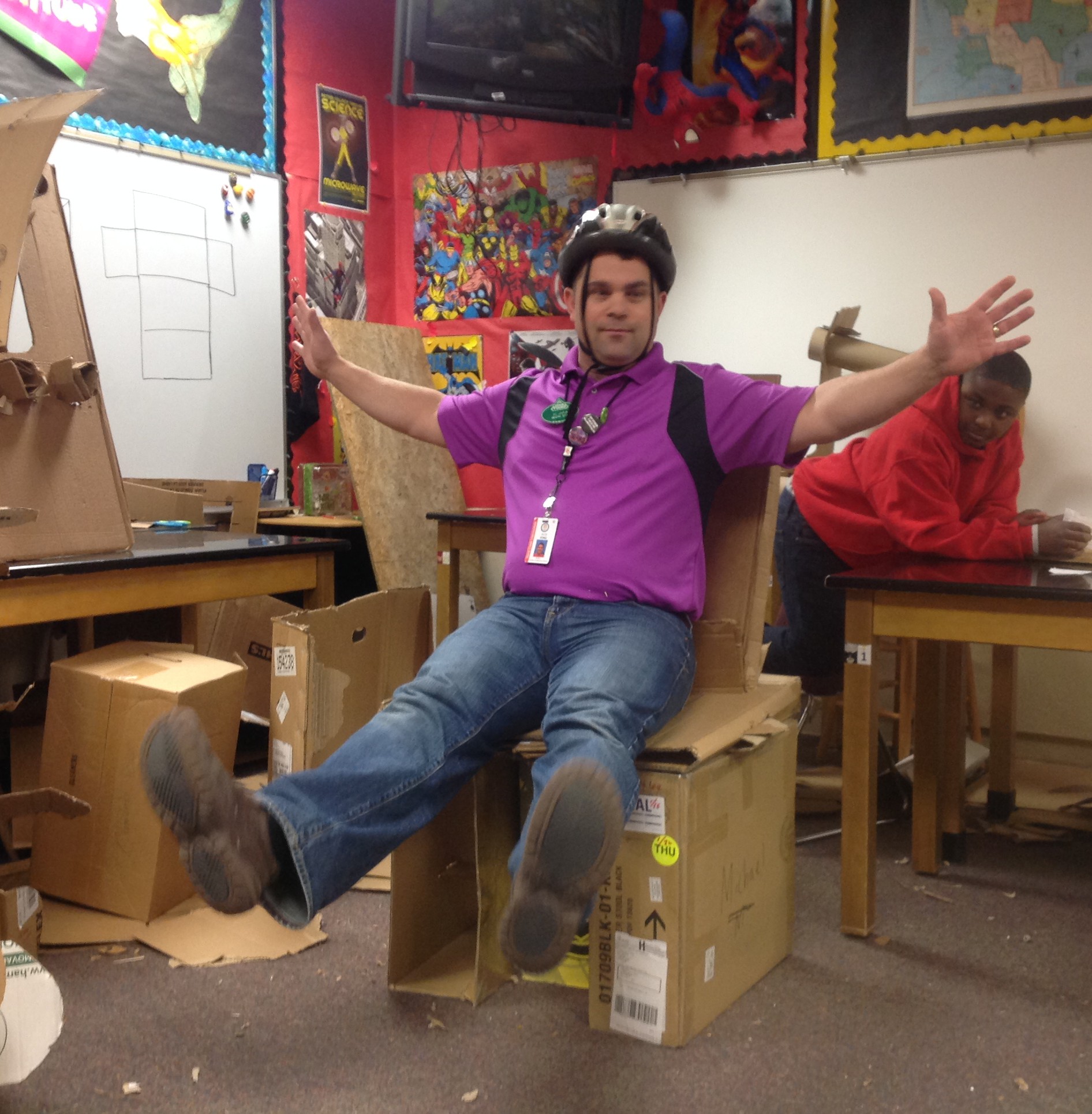 Through the chair-engineering process, the students mirrored a process that engineers use every day. Teams defined their problem and asked questions. They put creative problem-solving skills to work, brainstorming options and designing. They planned, built, tested, and improved their creations until the day of truth–when Mr. King donned a helmet and tested the cardboard chairs himself!